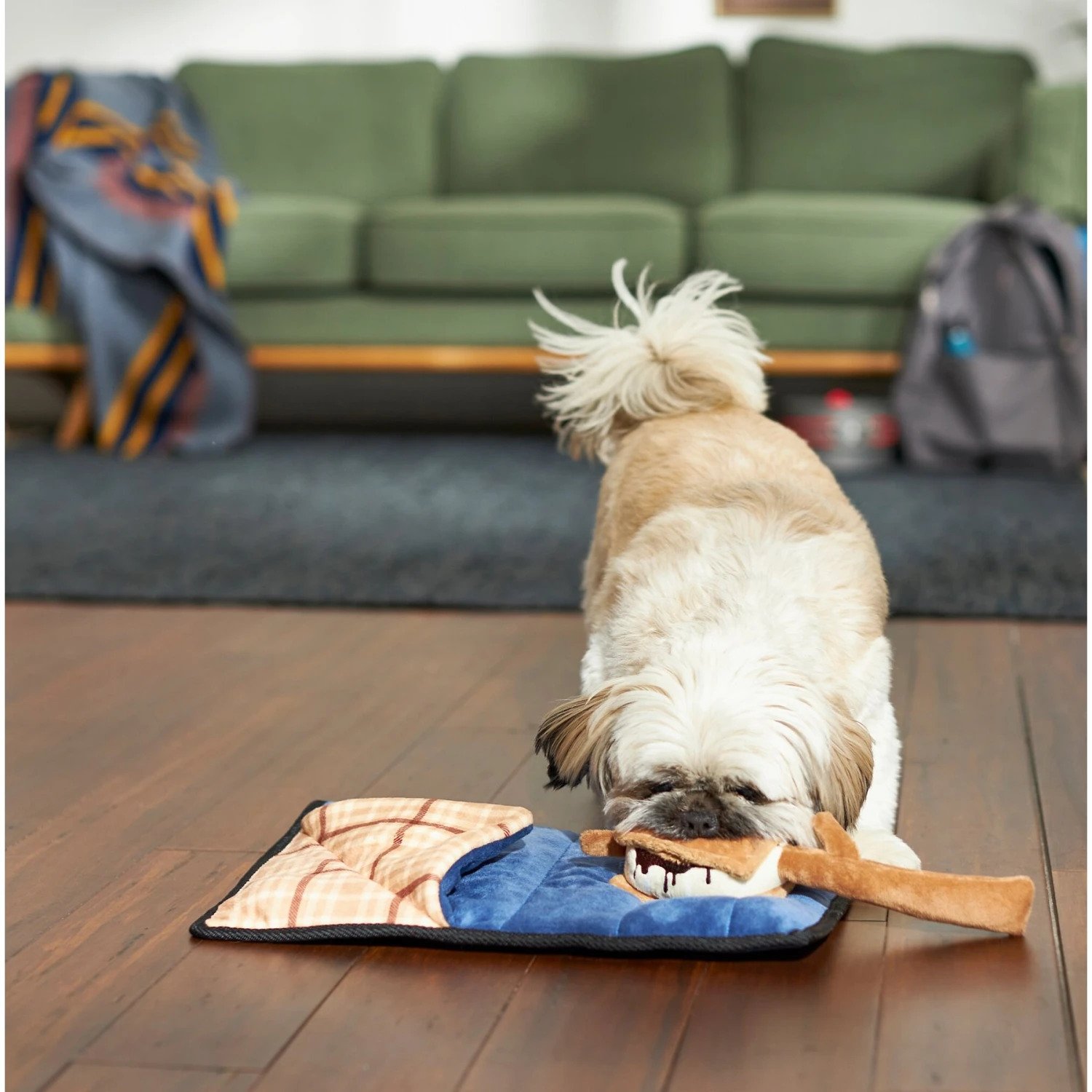 - Your pup gets two plush toys in one with sleeping bag and s’mores plushies.