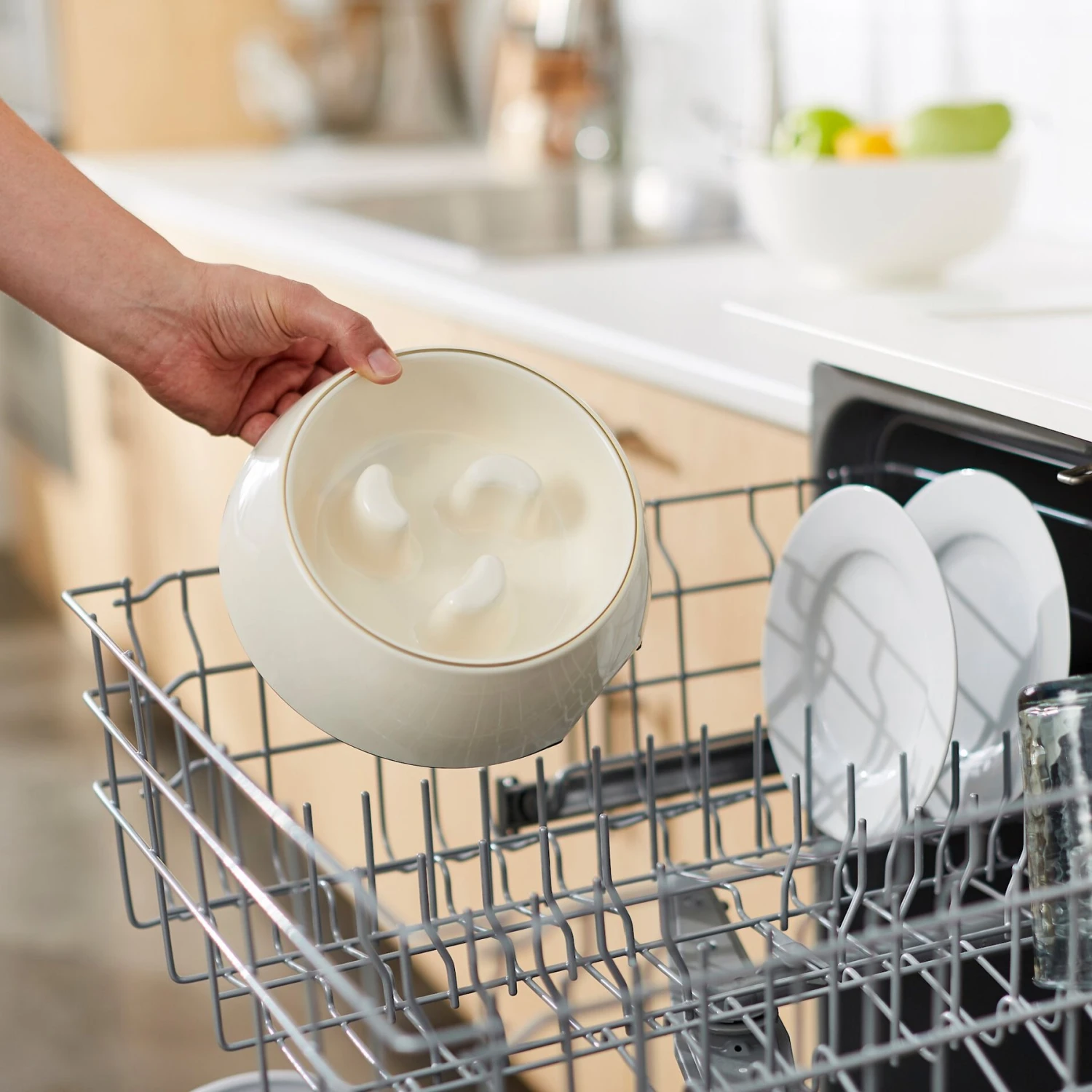 - Slow-feed design with raised columns inside the bowl helps fast eaters slow down.